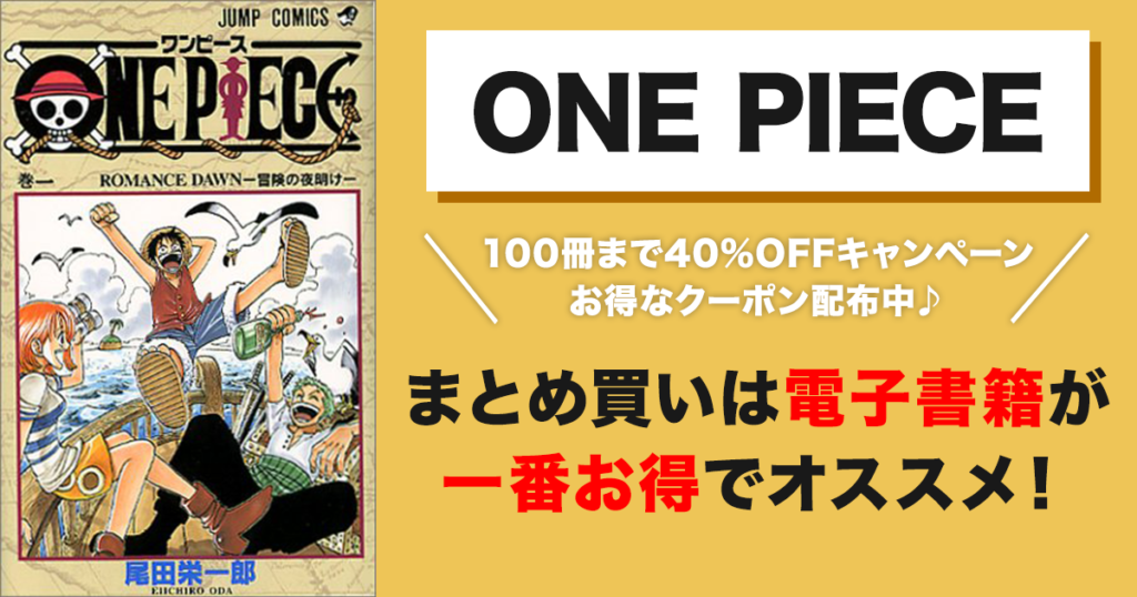 | 電子書籍 | 新規登録時のクーポン | ワンピースを全巻まとめ買いしたときの料金 |